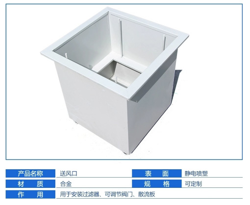 高效送風(fēng)口為千級(jí)、萬級(jí)、十萬級(jí)凈化空調(diào)系統(tǒng)較為理想的終端過濾裝置,可廣泛于醫(yī)藥、衛(wèi)生、電子、化工等行業(yè)的凈化空調(diào)系統(tǒng)。高效送風(fēng)口是用作改造和新建1000-300000級(jí)各級(jí)潔凈室的終端過濾裝置,是滿足凈化要求的關(guān)鍵設(shè)備。高效送風(fēng)口包含靜壓箱,散流板,高效過濾器,與風(fēng)管的接口可為頂接或側(cè)接。